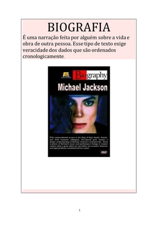O documento lista e descreve vários tipos de textos, incluindo biografias, acrósticos, adivinhas, bilhetes, poemas, contos de fadas, histórias em quadrinhos, fábulas, reportagens, charadas, músicas, avisos, convites, rótulos, diálogos, bulas de remédios, classificados, lendas, regras de jogos, horóscopos, e-mails, calendários, cartazes, charges, cartuns e receitas culinárias. Fornece breves def