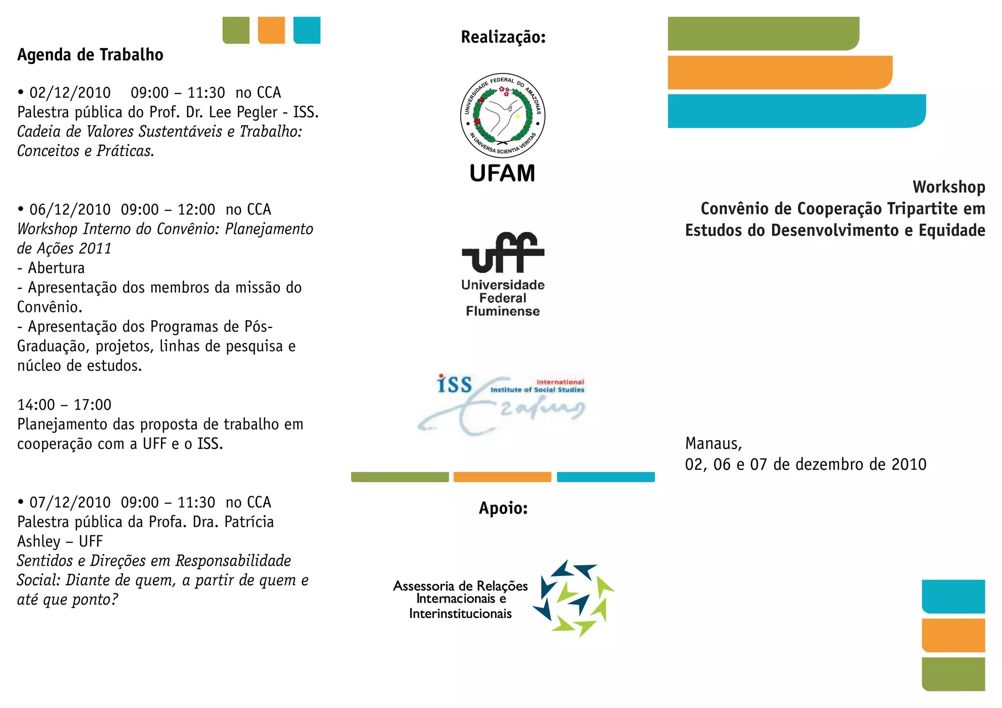 O documento descreve a agenda de trabalho de um convênio de cooperação tripartite entre a Universidade Federal do Amazonas, a Universidade Federal Fluminense e o International Institute of Social Studies. A agenda inclui palestras, workshops e planejamento de ações futuras entre 02 e 07 de dezembro de 2010 em Manaus para promover pesquisa, pós-graduação, inovação e extensão em estudos de desenvolvimento e equidade.