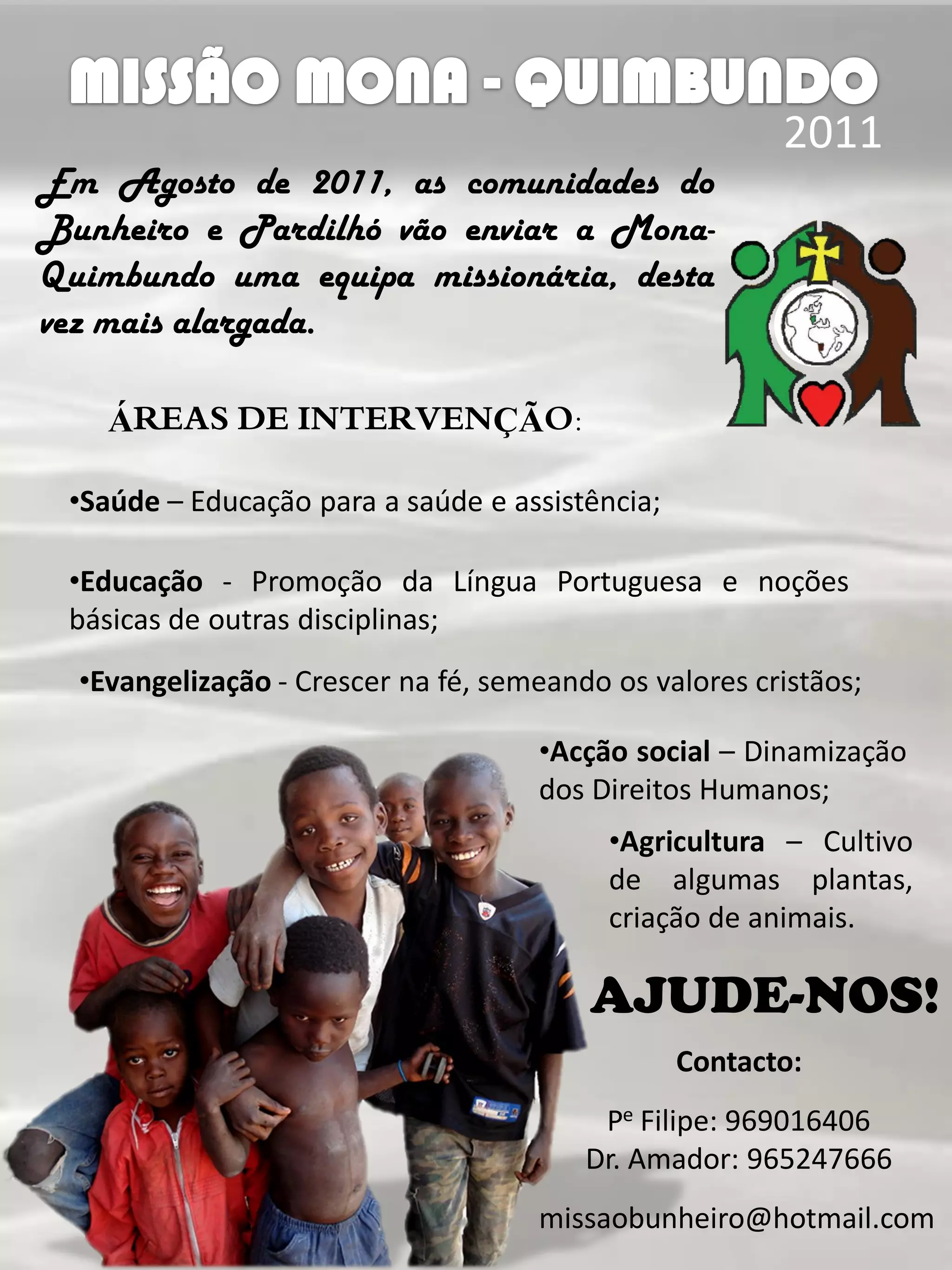 Em Agosto de 2011, as comunidades do Bunheiro e Pardilhó enviaram uma equipa missionária mais alargada para a Mona-Quimbundo para trabalhar na saúde, educação, evangelização, ação social e agricultura.