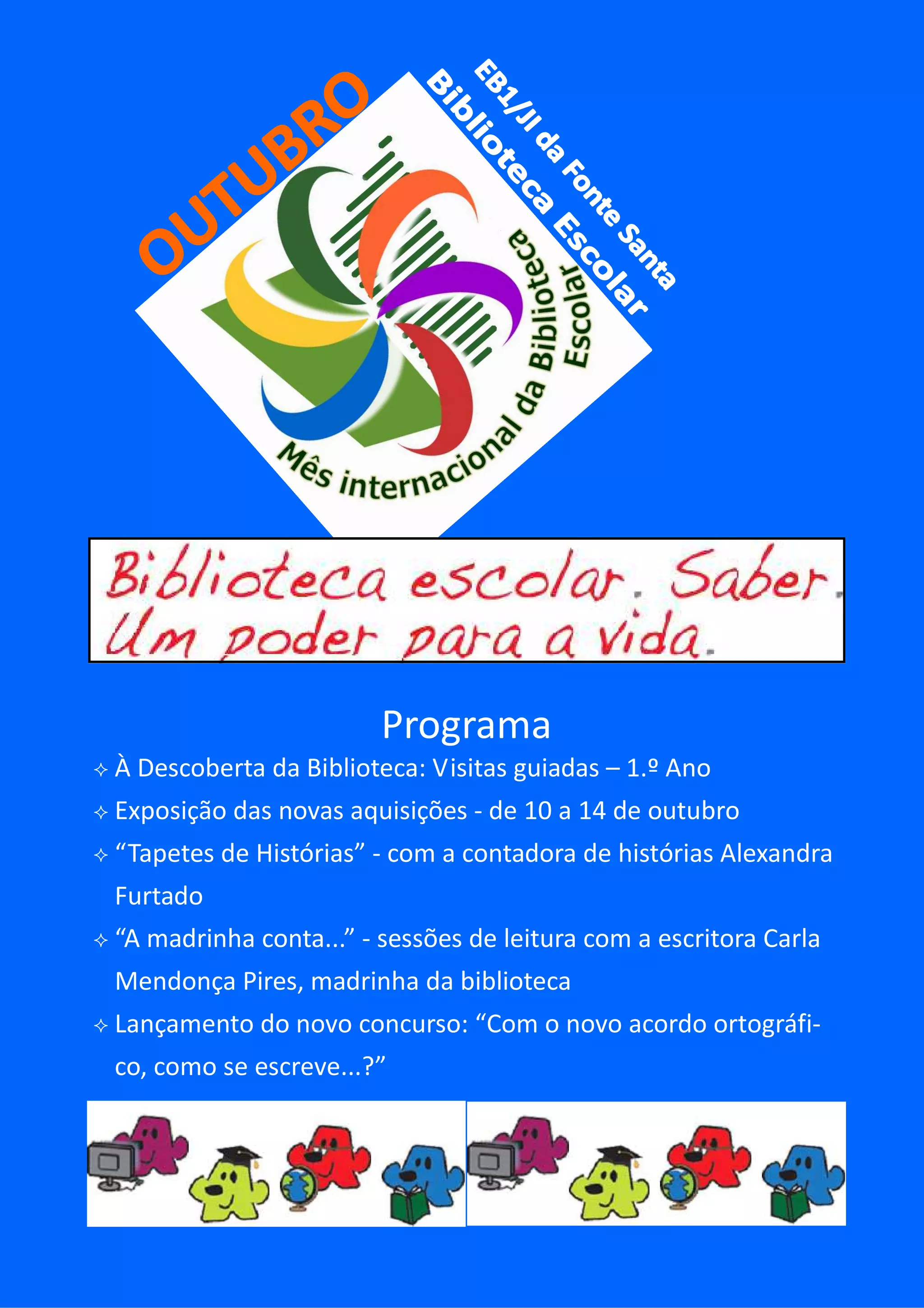 A biblioteca realizará várias atividades para estudantes e público em geral no mês de outubro, incluindo visitas guiadas para alunos do 1o ano, uma exposição de novas aquisições de 10 a 14 de outubro, sessões de contos com a contadora de histórias Alexandra Furtado e sessões de leitura com a escritora Carla Mendonça Pires. Também lançará um novo concurso sobre a ortografia.