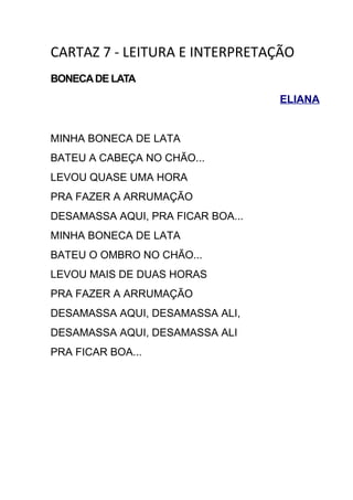Este poema de três estrofes descreve os danos causados à boneca de lata da menina Eliana e o tempo que levou para consertá-la. Na primeira estrofe, a boneca bateu a cabeça no chão e levou quase uma hora para consertá-la. Na segunda, ela bateu o ombro no chão e levou mais de duas horas para consertá-la. A menina desamassa a boneca para deixá-la boa novamente.