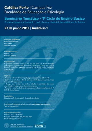 Este documento anuncia um seminário temático sobre a articulação curricular nos níveis iniciais da educação básica. O seminário será realizado em 27 de junho de 2012 na Faculdade de Educação e Psicologia da Universidade Católica do Porto e tem como objetivos promover o desenvolvimento pedagógico e organizacional do 1o ciclo do ensino básico, potenciar a reflexão sobre a articulação curricular, e divulgar boas práticas de ensino.