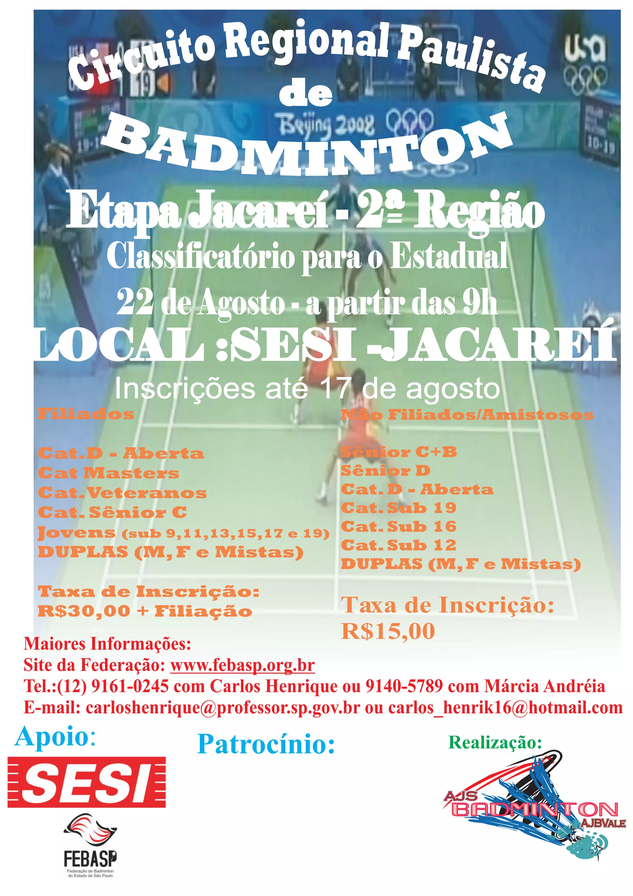 O documento anuncia um torneio classificatório para o Campeonato Estadual de Badminton que ocorrerá no dia 22 de agosto no SESI em Jacareí. O torneio é para categorias individuais e duplas de diferentes idades e níveis. As inscrições devem ser feitas até 17 de agosto com taxas variando para filiados e não filiados.