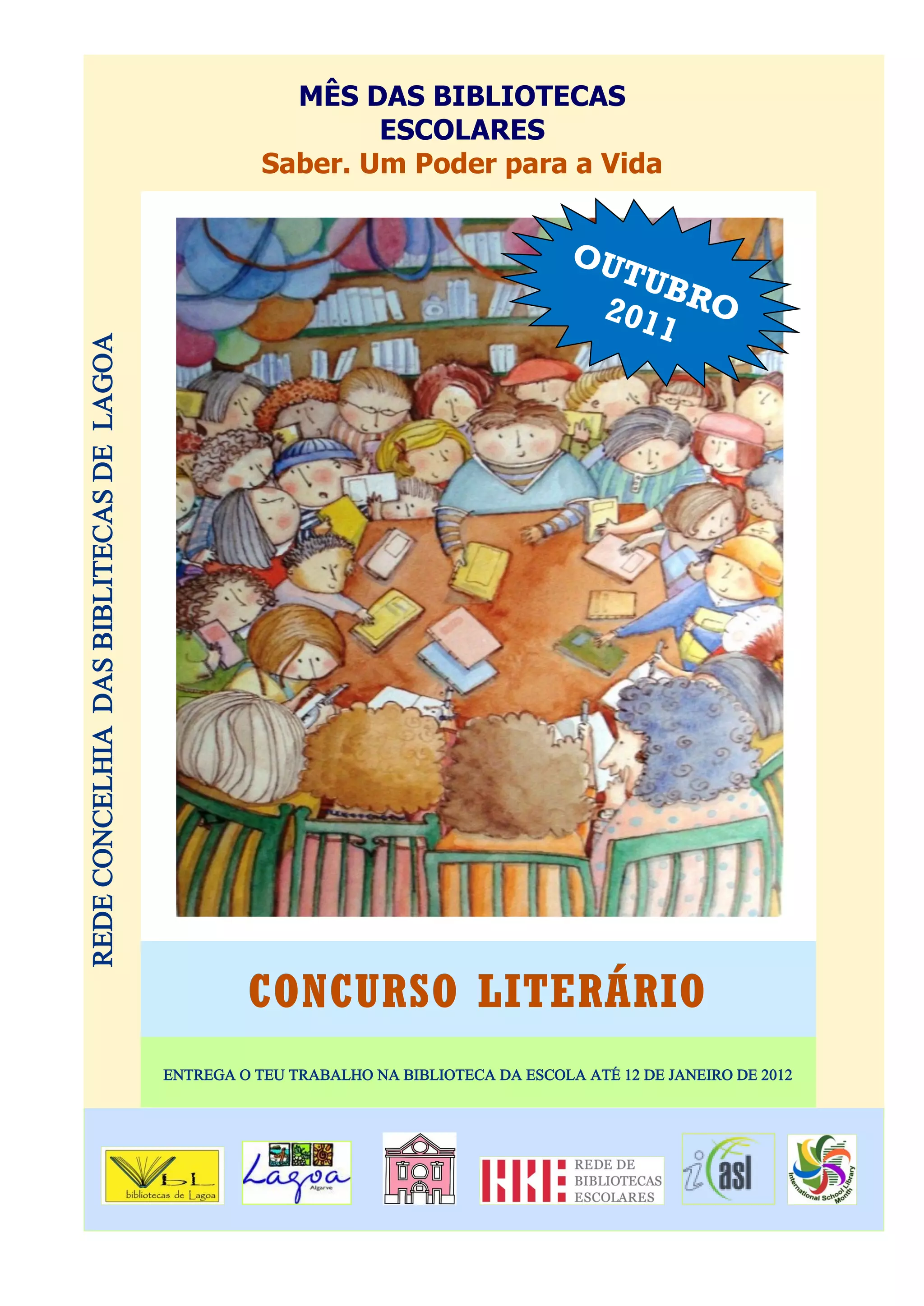 O documento anuncia um concurso literário promovido pelas bibliotecas escolares da rede municipal de Lagoa, com prazo para entrega dos trabalhos até 12 de janeiro de 2012, como parte das comemorações do Mês das Bibliotecas Escolares, com o objetivo de incentivar o saber e o poder que o conhecimento traz para a vida.