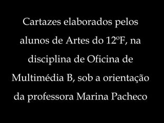 Os alunos do 12oF da disciplina de Oficina de Multimédia B criaram cartazes sob a orientação da professora Marina Pacheco. Os alunos estudaram Artes. A professora Marina Pacheco orientou os alunos na criação de cartazes como parte da disciplina de Oficina de Multimédia B.