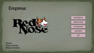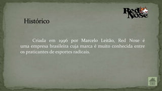 A empresa Red Nose foi criada em 1996 por Marcelo Leitão e fabrica calçados, roupas e óculos de sol para praticantes de esportes radicais. O documento lista duas alunas, detalha os produtos da Red Nose e inclui um banner promocional da empresa com o slogan "Exceda seus limites".