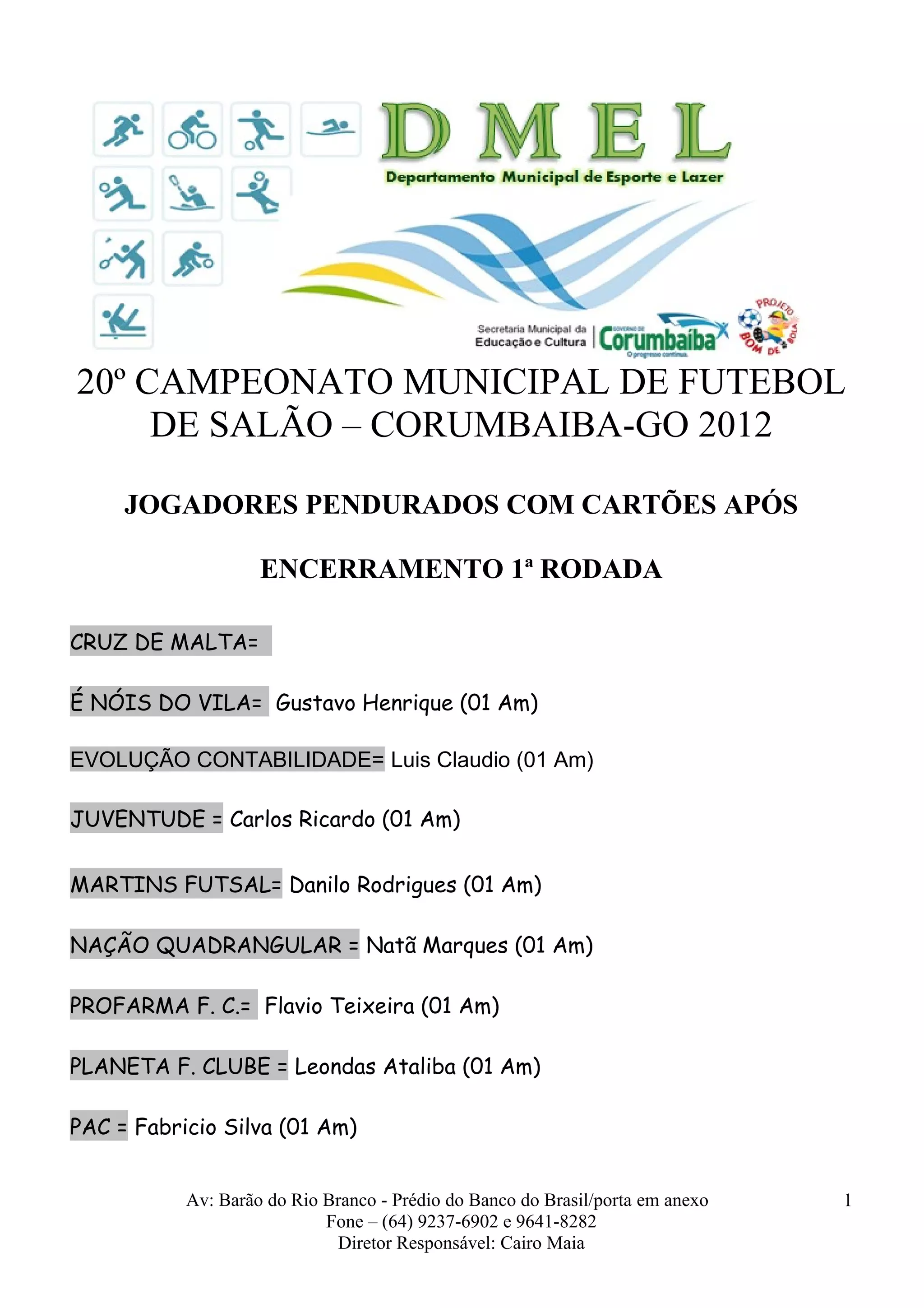 O documento lista os jogadores que receberam cartões amarelos após a conclusão da primeira rodada do 20o Campeonato Municipal de Futebol de Salão de Corumbaíba-GO em 2012. São nomeados os jogadores e suas respectivas equipes que receberam um cartão amarelo e terão que ficar pendurados. Informa também que os cartões amarelos serão eliminados na fase semifinal, enquanto os vermelhos resultarão em uma partida de suspensão.