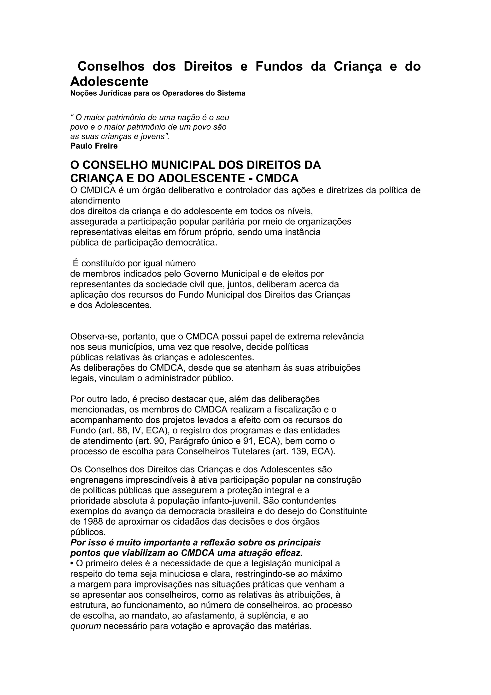 O documento discute os Conselhos Municipais dos Direitos da Criança e do Adolescente (CMDCA), que são órgãos responsáveis por deliberar políticas públicas para crianças e adolescentes. O CMDCA elabora o Plano Plurianual (PPA), a Lei de Diretrizes Orçamentárias (LDO) e a Lei Orçamentária Anual (LOA) para a aplicação dos recursos do Fundo Municipal dos Direitos da Criança e do Adolescente (FMDCA).