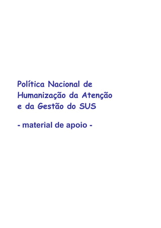 Este documento apresenta os princípios e dispositivos da Política Nacional de Humanização da Atenção e Gestão do SUS (HumanizaSUS), que visa promover a valorização dos usuários, trabalhadores e gestores do SUS, o fortalecimento do trabalho em equipe, e a construção de redes solidárias e participativas no sistema de saúde. Os principais dispositivos incluem acolhimento com classificação de risco, equipes de referência e apoio matricial, projeto terapêutico singular, e grupos de trabalho de humanização. O objetivo é as