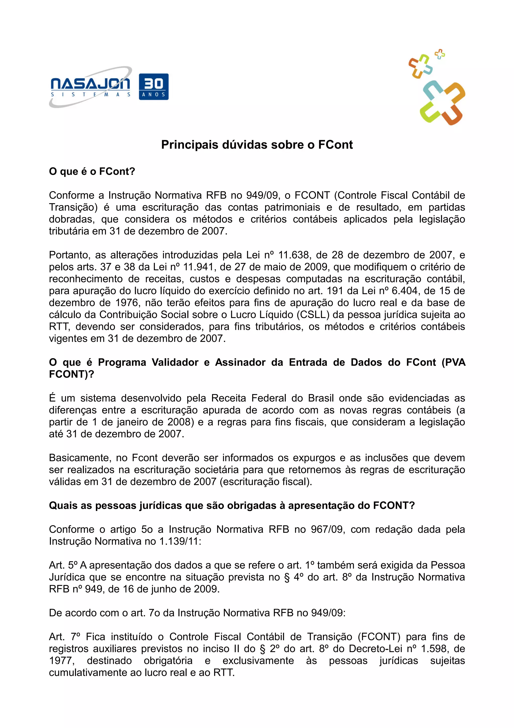 O documento explica o que é o FCont, que é uma escrituração contábil que considera os métodos e critérios contábeis aplicados em 31 de dezembro de 2007 para fins tributários. Apresenta também quem é obrigado a entregar o FCont, o prazo para entrega que é até o final de junho, e as penalidades pela não entrega ou entrega atrasada.