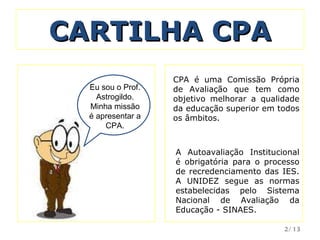 A CPA é uma Comissão Própria de Avaliação que avalia dez dimensões em instituições de ensino superior para melhorar sua qualidade. A avaliação é feita em duas etapas, com autoavaliação interna e avaliação externa pelo INEP. Todos os membros da comunidade acadêmica devem participar respondendo questionários para identificar pontos fortes e fracos e implementar melhorias contínuas.