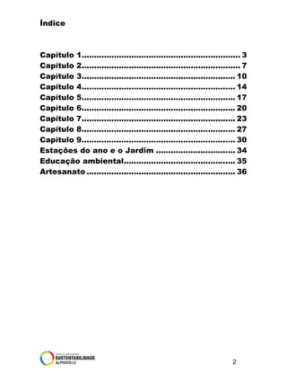 Este documento apresenta um curso de jardinagem dividido em 9 capítulos, abordando tópicos como cuidados básicos com plantas, partes da planta, tipos de plantas, solo, adubação, técnicas de plantio, controle de pragas e doenças. O documento fornece informações práticas sobre como cultivar plantas de forma sustentável.