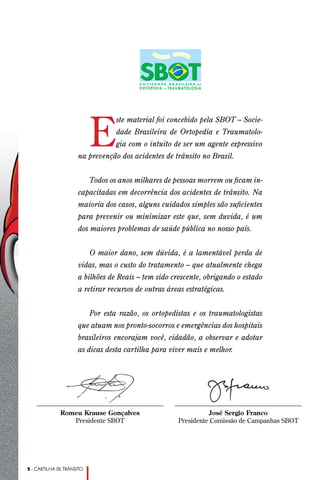 O documento resume as principais estatísticas sobre acidentes de trânsito no Brasil. Milhares morrem ou ficam incapacitados a cada ano devido a acidentes, que representam um grande problema de saúde pública. Acidentes envolvendo motocicletas estão aumentando e são a principal causa de internações para jovens entre 15-39 anos. Os acidentes geram bilhões em custos para o sistema de saúde brasileiro.
