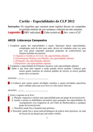 Este documento fornece os requisitos para completar as especialidades do Clube de Líderes Pioneiros. Inclui especialidades como liderança campestre, fogueiras e cozinha ao ar livre, excursionismo com mochila e orientação. O candidato deve completar quatro das especialidades listadas, além da especialidade de primeiros socorros, e cumprir outros requisitos como planejar atividades ao ar livre e ensinar habilidades de acampamento.