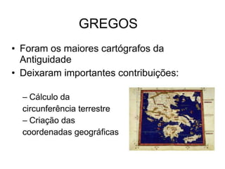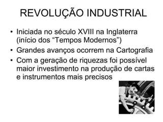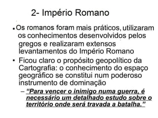 2) Existem quatro fases históricas da cartografia: mapas militares/navegação, levantamentos romanos, Descobrimentos portugueses, mapeamento sistemático desde o século XVIII.