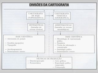 O documento discute técnicas de mapeamento e cartografia, incluindo modelos de representação da superfície terrestre, técnicas de levantamento como aerolevantamento, sensoriamento remoto e GPS, marcos geodésicos, escalas numéricas e gráficas, curvas de nível, perfis topográficos, mapas topográficos, projeções cartográficas como Mercator e Peters, e legendas.
