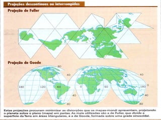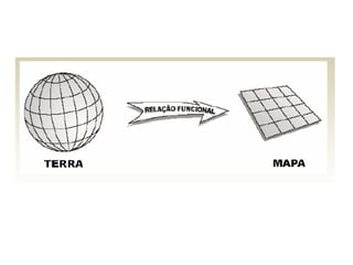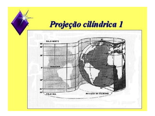 O documento discute cartografia e projeções cartográficas. Ele explica que os sistemas de projeções usam fórmulas matemáticas para transformar coordenadas geográficas da superfície esférica em coordenadas planas em mapas, mantendo correspondência entre elas. Algumas projeções comuns incluem a projeção cilíndrica, na qual a superfície terrestre é projetada em um cilindro tangente ao elipsóide.