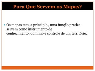 O documento discute como os mapas servem como instrumentos de conhecimento e controle de territórios, e fornece detalhes sobre elementos essenciais de um mapa como título, orientação, escala e legenda. Também apresenta diferentes tipos de representações cartográficas como atlas, globo, mapas, cartas e plantas.