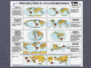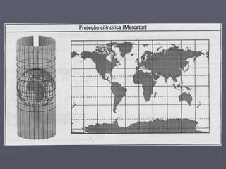 O documento discute a evolução da cartografia desde as pinturas rupestres até os mapas digitais modernos. Apresenta diferentes tipos de mapas e cartas, técnicas de mapeamento, sistemas de projeção e elementos essenciais de um mapa. Também aborda conceitos como escala, curvas de nível, projeções cilíndrica e conforme.