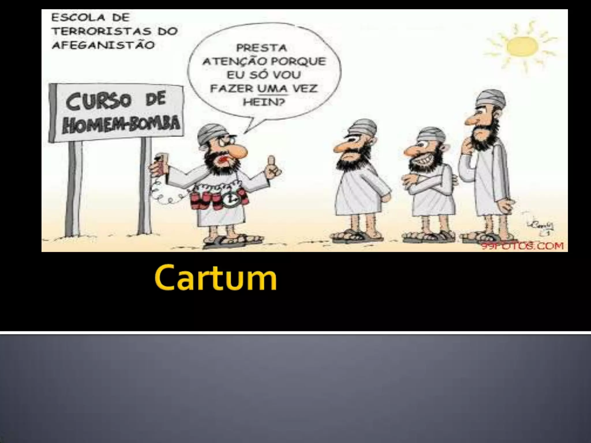 Um cartoon é um desenho humorístico que critica aspectos da sociedade de forma concisa. Sua origem vem de charges publicadas na revista Punch na década de 1840 para satirizar eventos políticos. Cartunistas usam estilos próprios de desenho para criar charges que influenciam outros artistas.