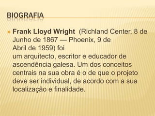 Frank Lloyd Wright projetou a Casa da Cascata em 1934 na Pensilvânia rural. Parcialmente construída sobre uma queda d'água, a casa incorpora elementos naturais como pedras e vegetação em sua arquitetura orgânica. Foi a residência de verão do empresário Edgar Kaufmann Sr. e sua família.