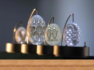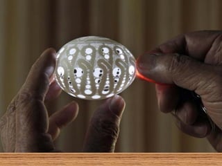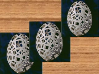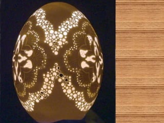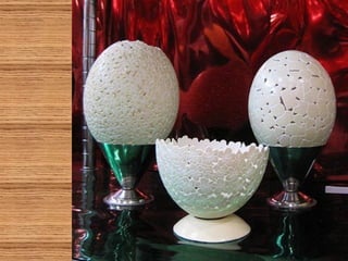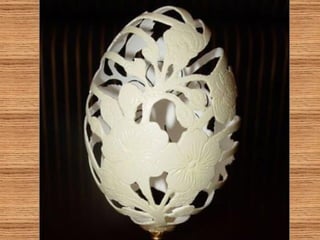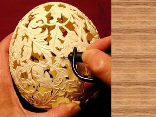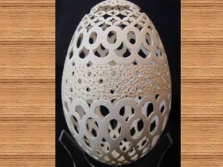 O documento descreve a arte de esculpir cascas de ovos, com exemplos de artistas russos, americanos e indianos que criam desenhos delicados e complexos nas cascas usando apenas furadeiras. Alguns fazem pinturas em ovos de avestruz ou usam as cascas para criar lâmpadas e objetos decorativos com temas como o Taj Mahal ou os signos do zodíaco. A criação artística com cascas de ovos é infinita e valoriza a arte.
