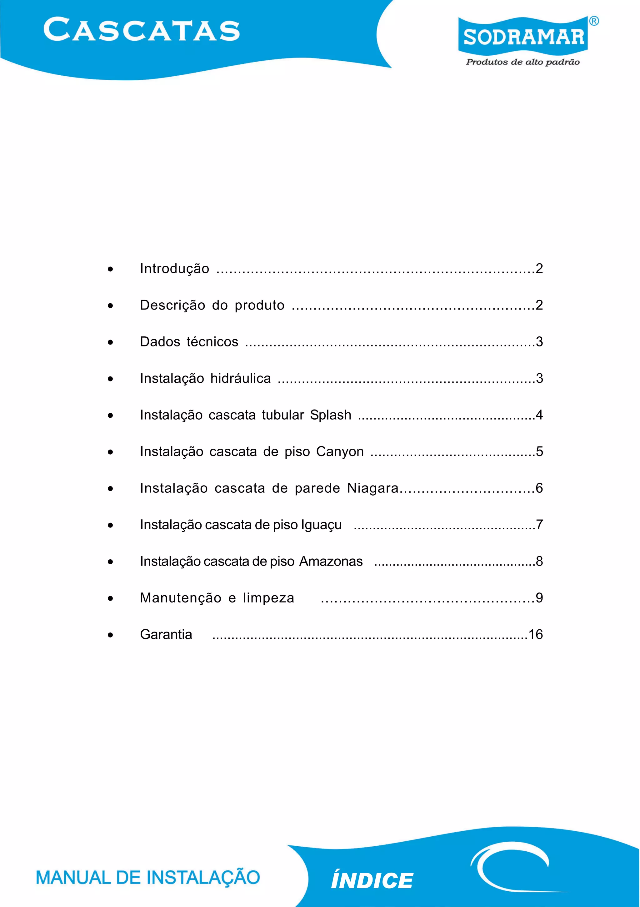 O documento fornece instruções sobre a instalação e manutenção de diferentes modelos de cascatas fabricadas em aço inoxidável. Descreve os 5 modelos disponíveis, seus dados técnicos e esquemas de instalação hidráulica. Também inclui dicas sobre limpeza do aço inoxidável e como evitar corrosão.