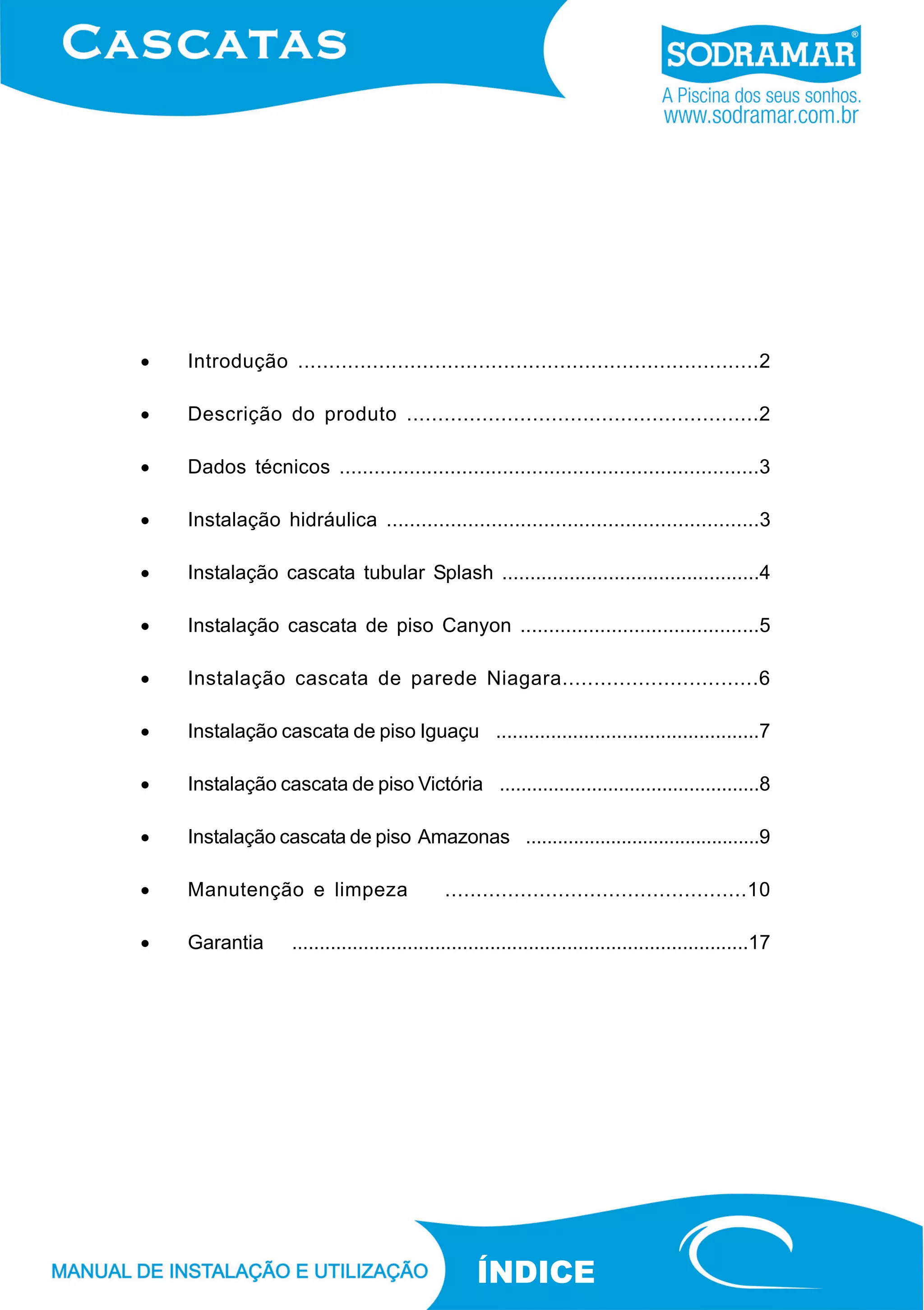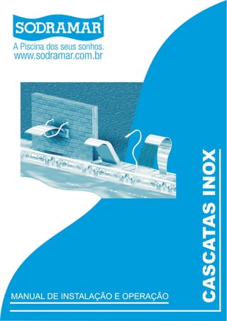 O documento fornece instruções detalhadas para a instalação de 6 modelos de cascatas de água fabricadas em aço inoxidável, descrevendo os passos para a instalação hidráulica e fixação de cada modelo, além de orientações sobre manutenção e limpeza do material.