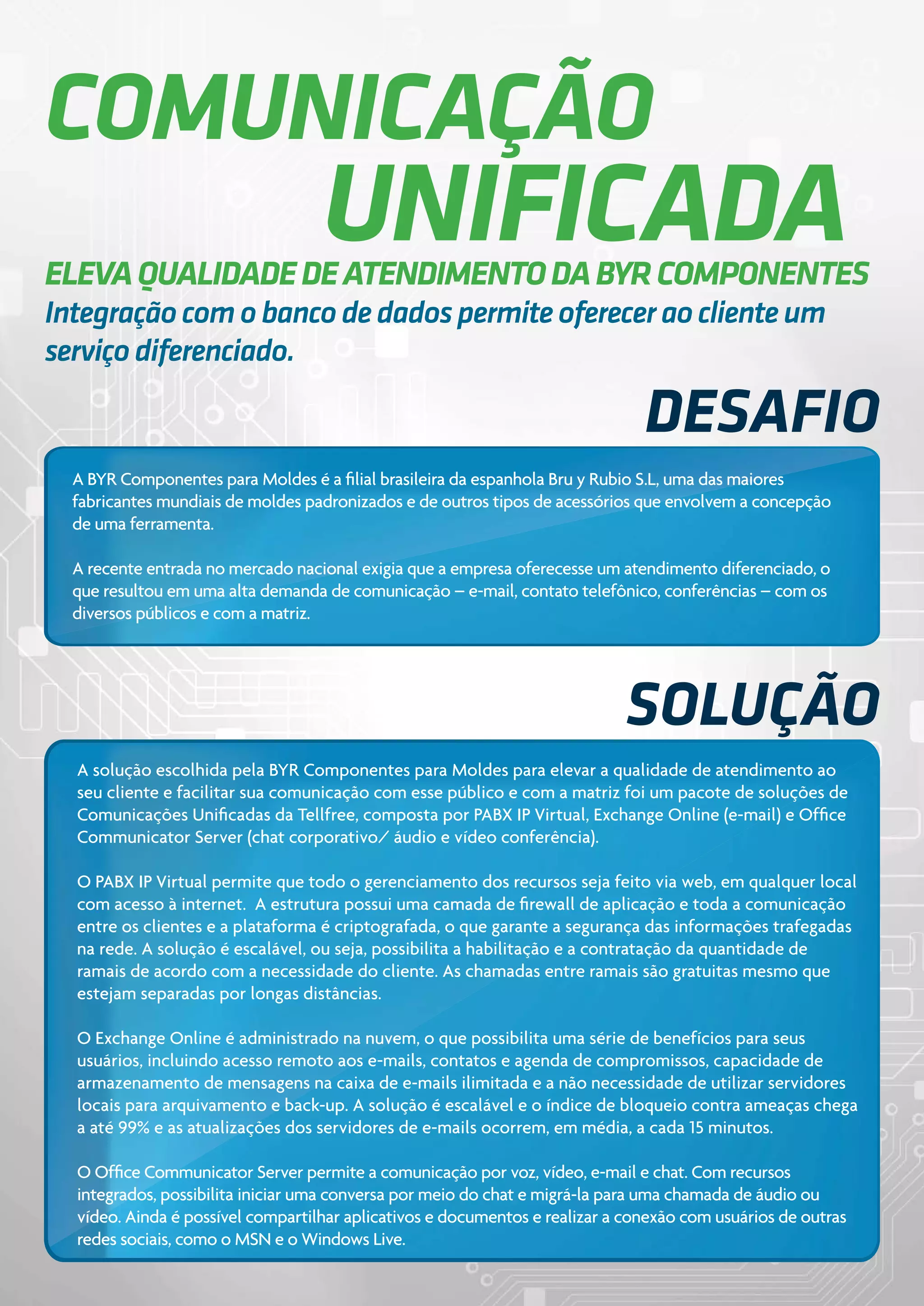 A BYR Componentes para Moldes adotou soluções de comunicações unificadas da Tellfree para melhorar o atendimento aos clientes e facilitar a comunicação com a matriz, integrando o banco de dados ao sistema. Isso permitiu oferecer um atendimento personalizado e reduzir spam, aumentar produtividade e garantir segurança de dados.