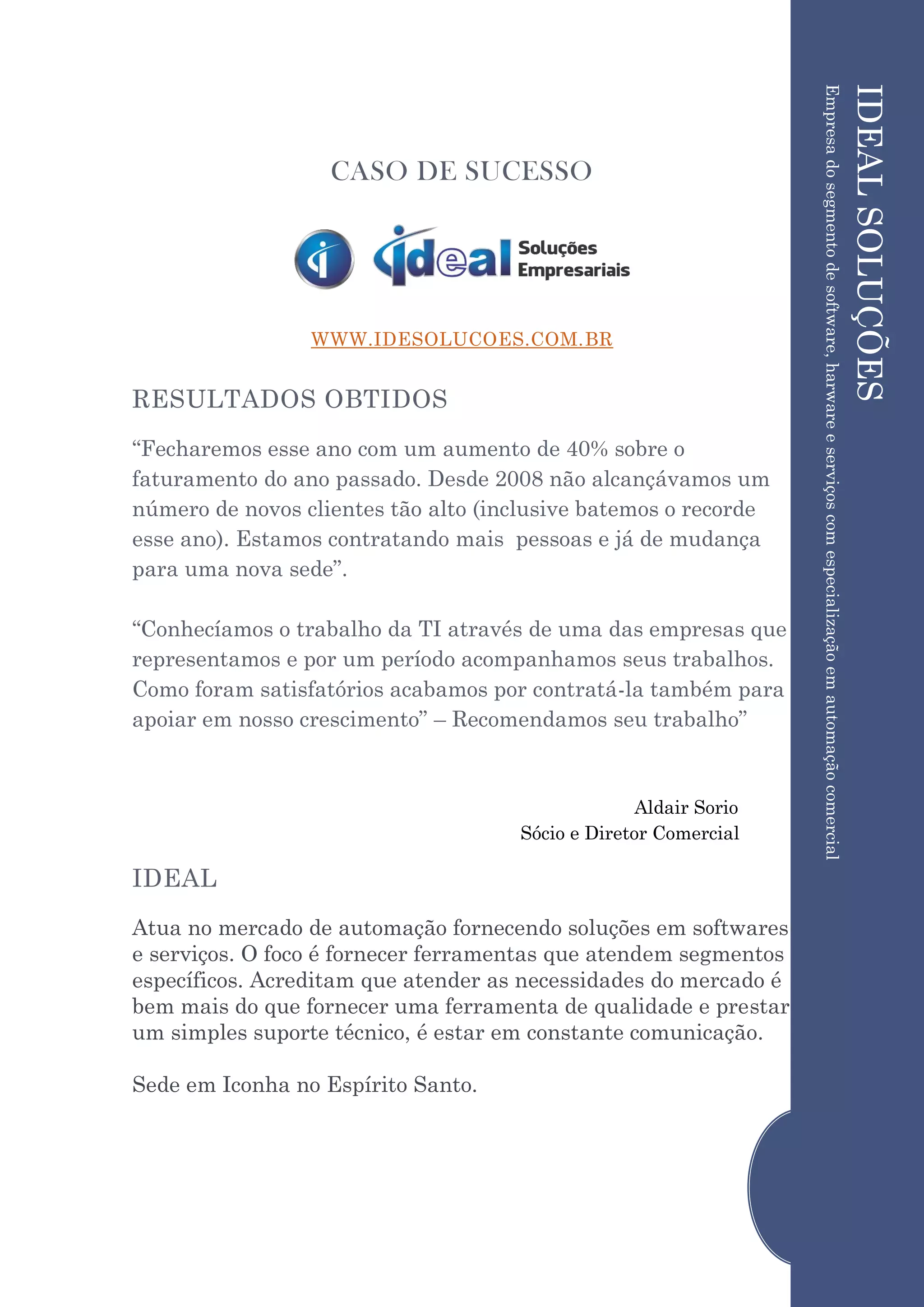 A empresa de tecnologia IDEALSOLUÇÕES relatou um aumento de 40% nas vendas e um recorde no número de novos clientes no ano, levando-os a contratar mais funcionários e mudar para um novo escritório. Um cliente recomendou o trabalho da IDEALSOLUÇÕES, dizendo que foram satisfatórios em apoiar seu crescimento. A IDEALSOLUÇÕES atua no mercado de automação fornecendo soluções em software e serviços focados em atender necessidades específicas de segmentos.