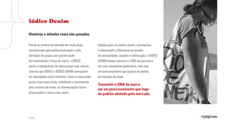 O documento descreve o reposicionamento da marca Iódice Denim para se diferenciar da marca-mãe Iódice. A Iódice Denim visa transmitir a essência da marca de forma original e verdadeira, fugindo dos padrões do mercado de moda, por meio de histórias e atitudes reais de pessoas da cidade.