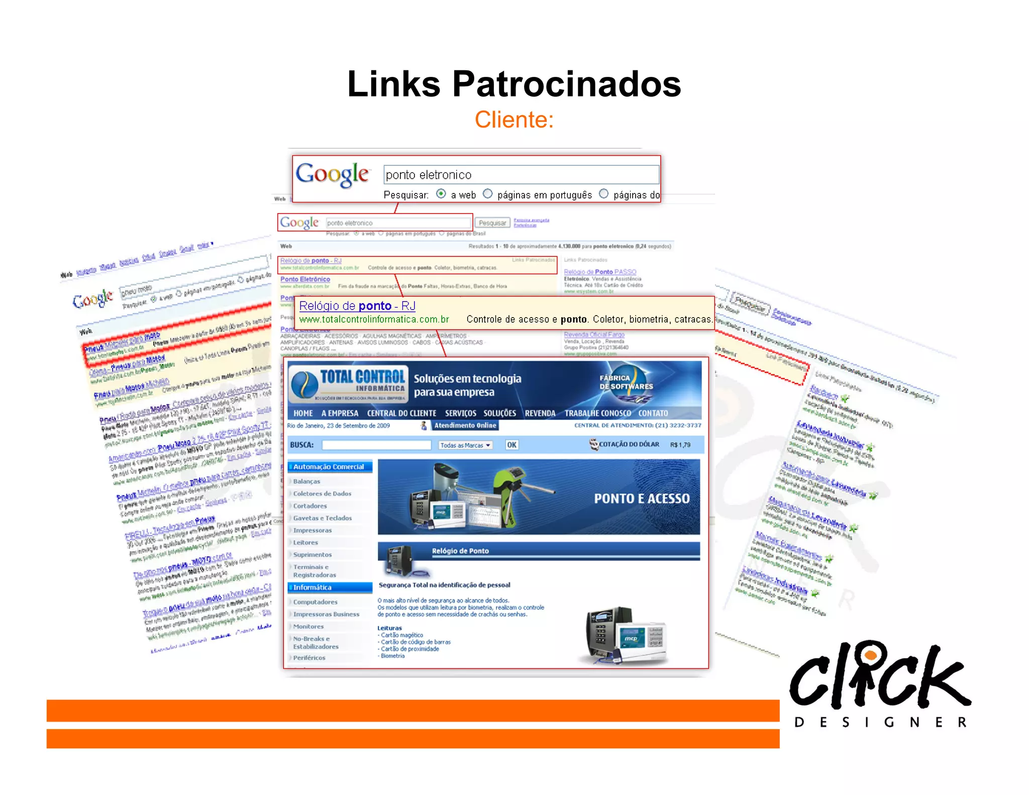 O documento fornece informações sobre links patrocinados e casos de clientes da Click Designer que utilizaram essa estratégia de marketing. Em resumo: