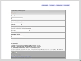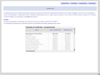 Este documento descreve o Programa de Desenvolvimento Profissional e Formação Pedagógica Docente da UNIFAL-MG para o triênio 2011-2013, com o objetivo de promover o aprimoramento contínuo dos docentes. A política institucional é baseada em quatro dimensões principais: organização acadêmica, fundamentos educacionais, bases sócio-culturais e recursos pedagógicos. O programa é implementado por meio de projetos institucionais e locais, com registro, avaliação e certificação da participação docente.