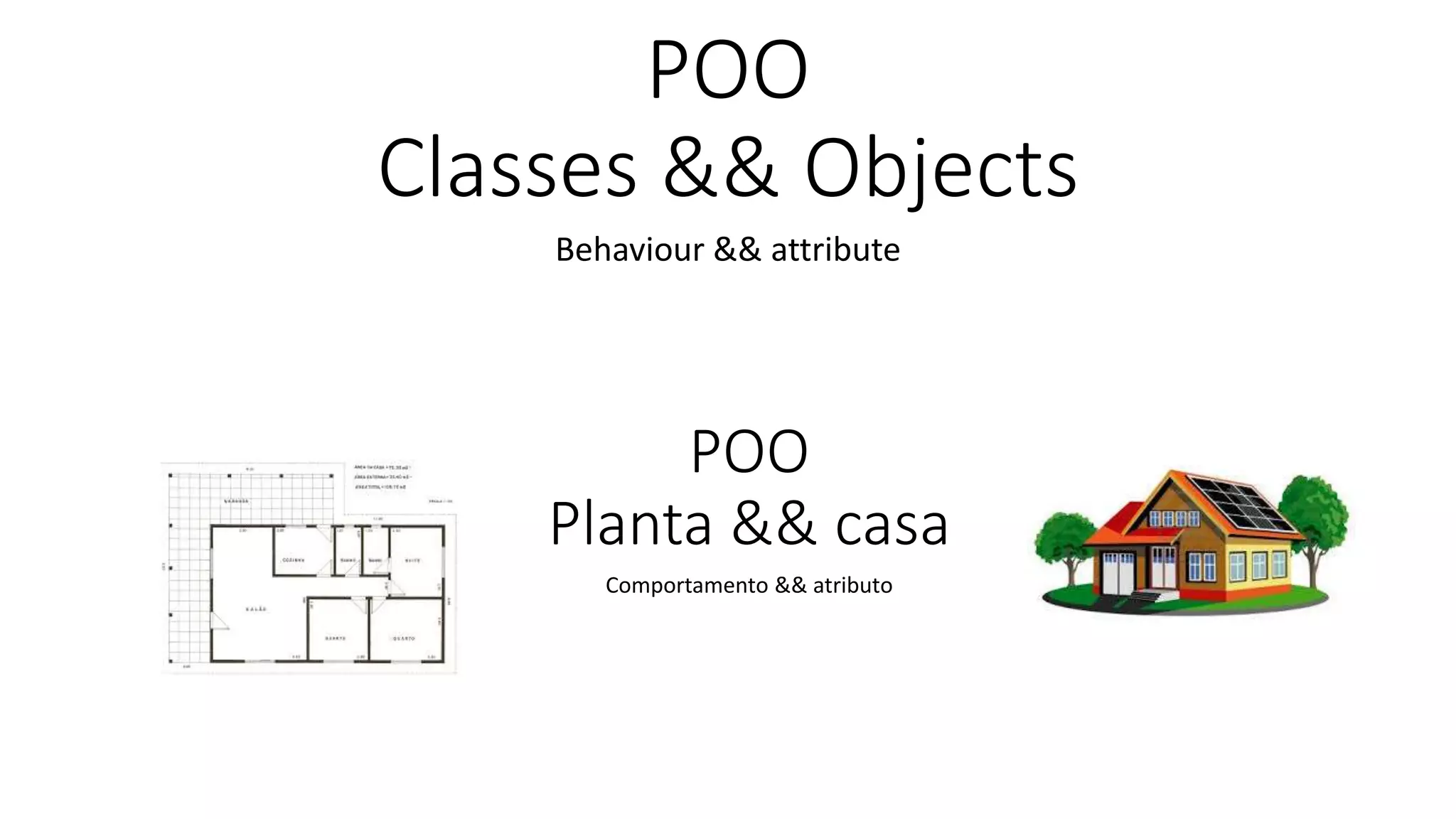 POO é uma programação orientada a objetos onde objetos são partes de um programa e têm classes, atributos e comportamentos. Classes definem as propriedades e ações dos objetos, como uma planta define uma casa, mas a casa é o objeto real. Classes permitem criar múltiplos objetos com características comuns.
