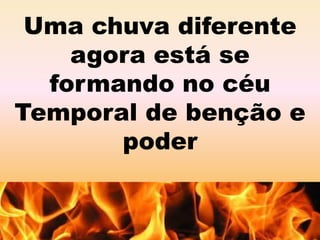 O documento descreve uma chuva de benção e poder que está caindo sobre a igreja. Ele fala sobre um calor glorioso de 500 graus que está queimando o pecado e destruindo as aflições, trazendo cura e vitória. A nuvem de vitória continua sobre a igreja e a promessa de Deus é que a chuva ainda vai cair, trazendo mais poder.