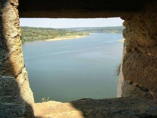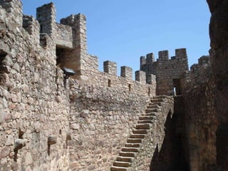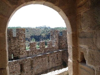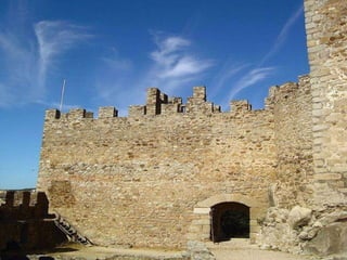 O Castelo de Almourol localiza-se numa ilha no rio Tejo em Vila Nova da Barquinha, Portugal. Construído originalmente no século I a.C. pelos romanos, o castelo passou por várias culturas ao longo dos séculos até ser conquistado por D. Afonso Henriques em 1129 e doado à Ordem dos Templários. O castelo adquiriu sua forma atual entre 1160-1171 e foi danificado pelo terramoto de 1755, passando por restaurações desde então.