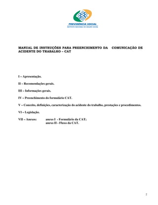 Este documento fornece instruções sobre o preenchimento do formulário de Comunicação de Acidente do Trabalho (CAT). Ele explica como preencher cada seção do formulário CAT, incluindo informações sobre o emissor, o acidentado, o acidente e as prestações. Além disso, fornece detalhes sobre quando e como comunicar acidentes, reaberturas e óbitos, dependendo do tipo de trabalhador.