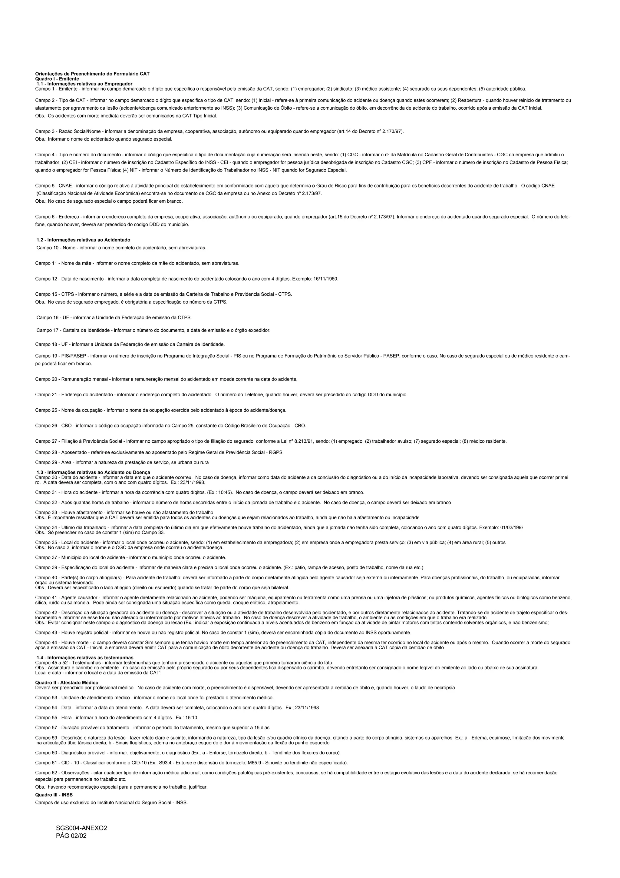 O documento fornece instruções detalhadas para preenchimento do formulário de Comunicação de Acidente de Trabalho (CAT), incluindo informações sobre o empregador, acidentado, acidente/doença, testemunhas e atestado médico.