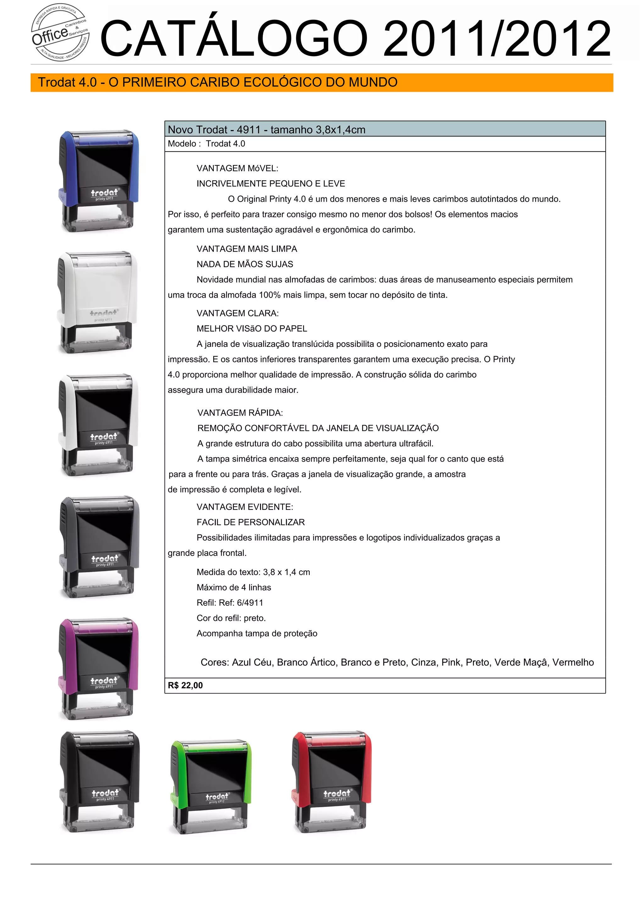 O documento descreve o novo carimbo autoentintado Trodat 4.0, que é o primeiro carimbo ecológico do mundo. Ele é extremamente pequeno e leve, tornando-o perfeito para transporte. Possui uma almofada de carimbo que permite troca limpa sem tocar na tinta e uma janela translúcida para melhor posicionamento. Está disponível em vários tamanhos e cores.