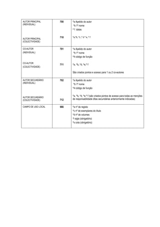 Este documento fornece recomendações sobre os campos e subcampos UNIMARC a usar para catalogar documentos eletrônicos, incluindo informações como título, autores, editor, descrição física, assuntos, classificação decimal, notas e links de acesso. É dada ênfase aos dados necessários para identificar e localizar o documento.