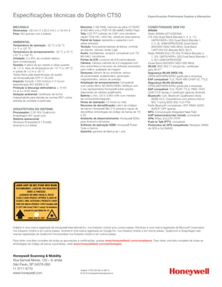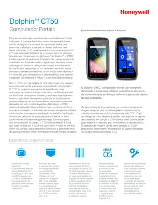 O documento descreve o computador móvel Dolphin CT50 da Honeywell, destacando suas principais características e benefícios. Em três frases: O CT50 oferece desempenho potente com um processador quad-core, um design resistente e leitor de código de barras 2D de alta performance. Ele é projetado para trabalhadores de campo e oferece conectividade confiável com suporte a sistemas operacionais Windows ou Android. O documento detalha as especificações técnicas do dispositivo para apoiar fluxos de trabalho mó