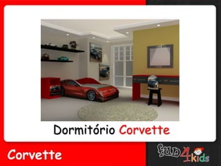 Este catálogo apresenta três itens de mobiliário: uma cama, um criado mudo e um dormitório completos da linha Corvette.