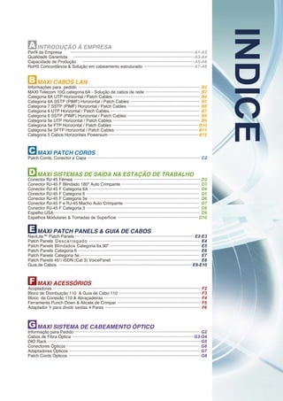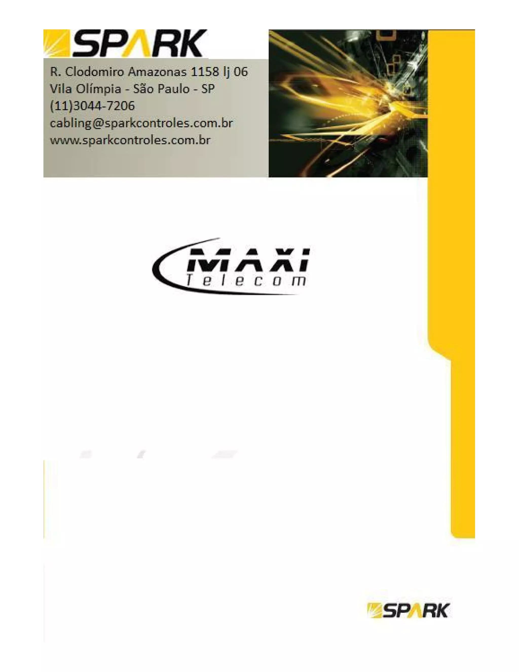 O documento fornece informações sobre os produtos e serviços oferecidos pela empresa Maxi Telecom. Ele descreve o perfil da empresa, sua capacidade de produção e compromisso com a qualidade garantida. Além disso, lista várias categorias de produtos como cabos LAN, patch cords, sistemas de saída na estação de trabalho, patch panels e acessórios.