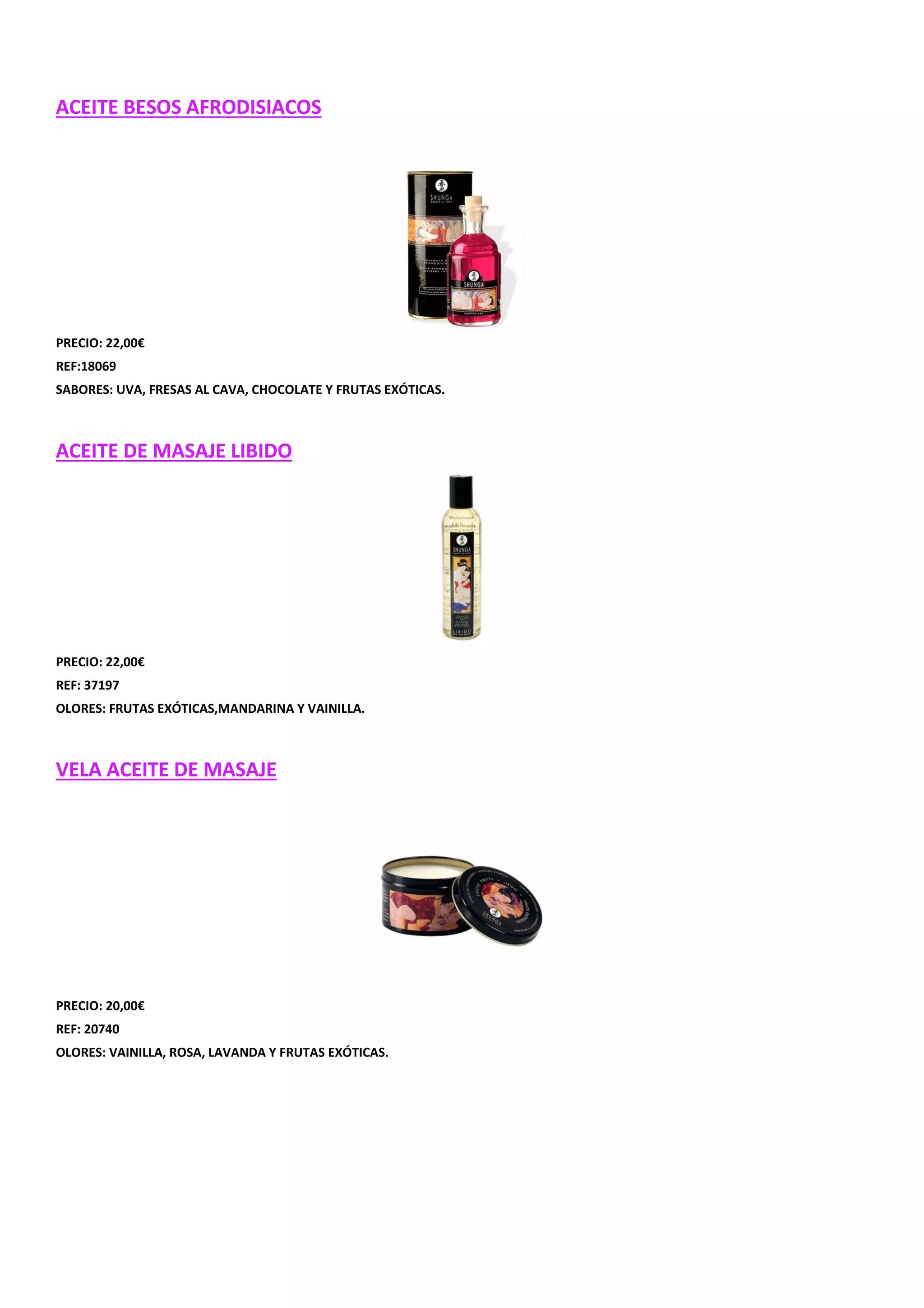 Este documento lista diversos produtos relacionados à sexualidade, incluindo afrodisíacos, massagens, brinquedos sexuais e lubrificantes. Fornece detalhes como preço, sabor e referência para cada item.