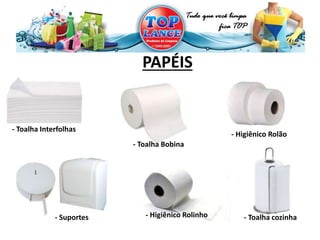 A lista inclui produtos de limpeza como alvejantes, sabões e desinfetantes. Também inclui papéis como papel higiênico, toalhas de papel e suportes para papel higiênico e toalhas. A lista ainda menciona linhas de produtos plásticos, acessórios, cozinha, cozinha industrial e material esportivo.