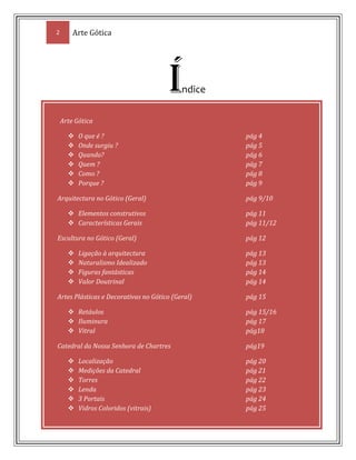 O documento descreve a arte gótica, incluindo sua origem na França no século XII, características arquitetônicas como o arco ogival e abóbada de cruzamento de ogivas, e como se desenvolveu em várias vertentes artísticas como escultura, vitrais e retábulos. Ele também fornece detalhes sobre a Catedral de Notre Dame em Chartres.