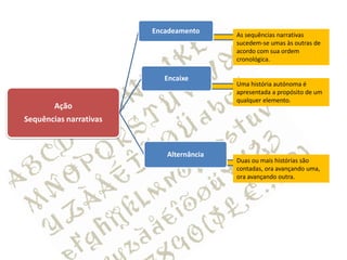 Este documento descreve as principais categorias da narrativa, como ação, sequências narrativas, personagens, caracterização, espaço, tempo e narrador. Apresenta os diferentes tipos de cada categoria, como protagonista vs personagem secundária, descrição direta vs indireta, focalização interna vs externa. Fornece uma estrutura abrangente para analisar e criar textos narrativos.