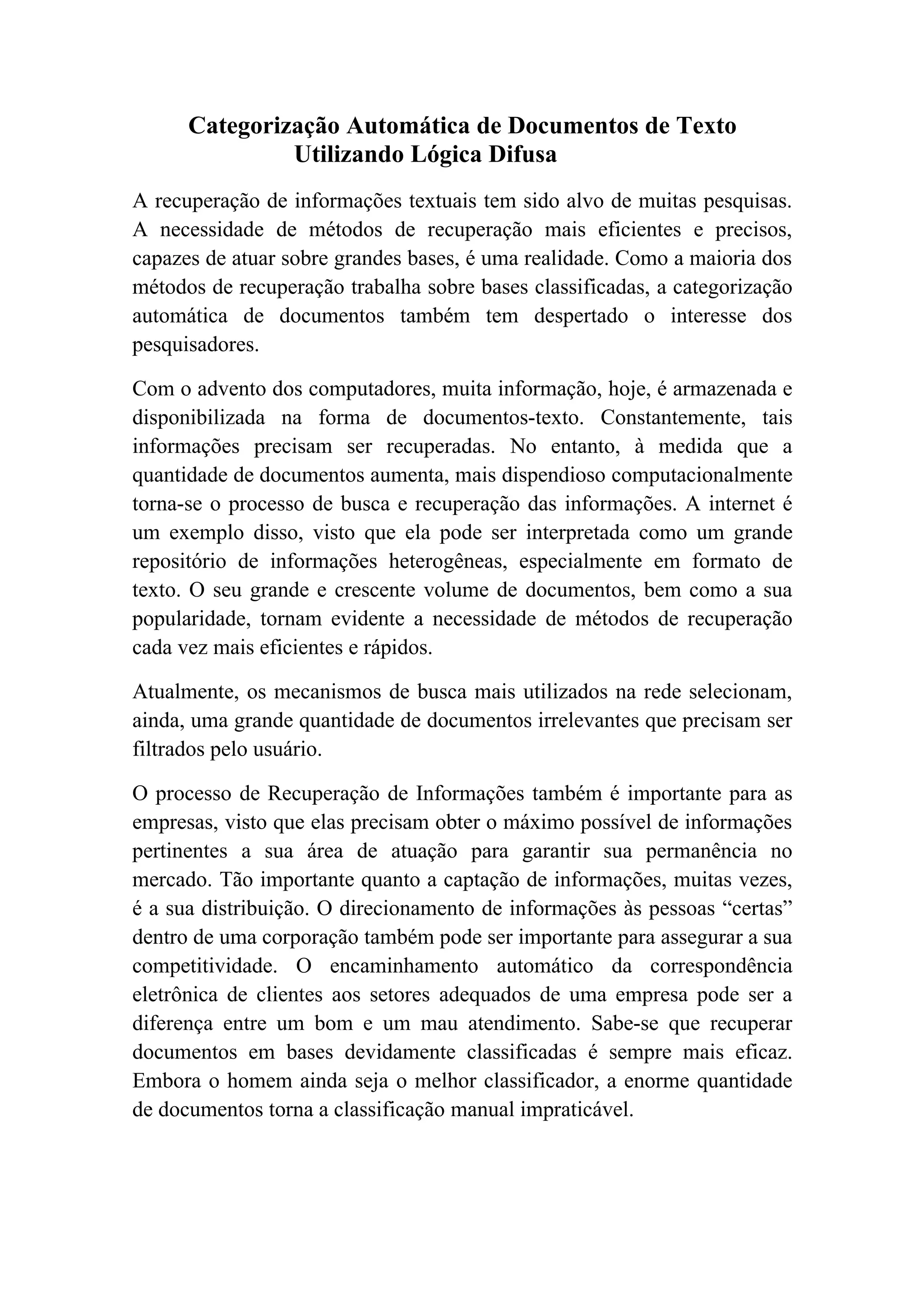 O documento discute a categorização automática de documentos de texto usando lógica difusa para melhorar a recuperação de informações. A necessidade de métodos de busca mais eficientes é apresentada devido ao grande volume de documentos online. A classificação automática de documentos pode ajudar a direcionar informações corretamente dentro de empresas.