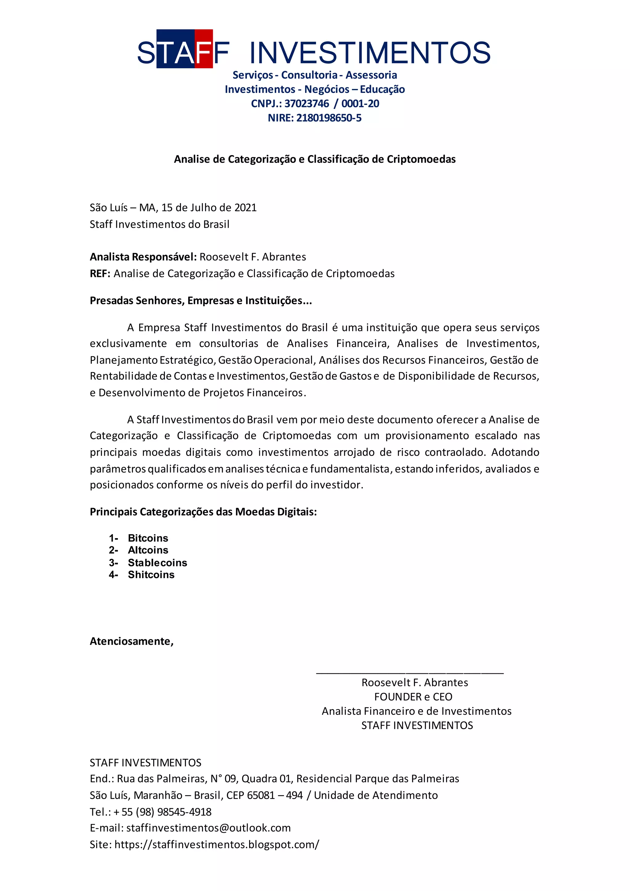 O documento fornece uma análise de categorização e classificação de criptomoedas, dividindo-as em Bitcoins, Altcoins, Stablecoins e Shitcoins. Ele também apresenta tabelas com as principais moedas em cada categoria, indicando valores para aportes de recursos em cada uma delas.