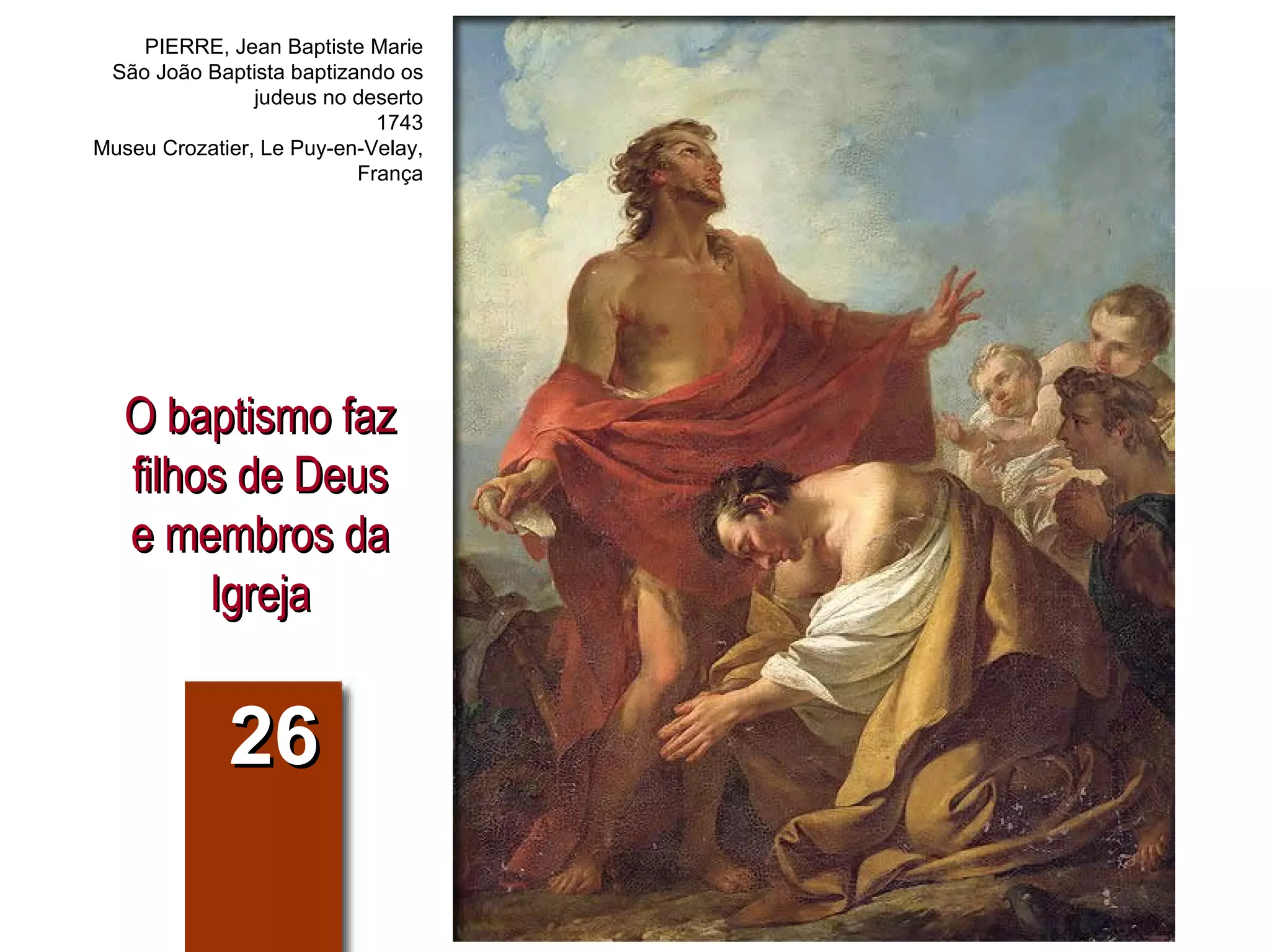 O documento discute o sacramento do batismo cristão. Ele descreve o batismo como o primeiro sacramento da iniciação que regenera os filhos de Deus e os incorpora à Igreja. O batismo apaga o pecado original, infunde a graça santificante, confere caráter sacramental e incorpora a Jesus Cristo e à Igreja.
